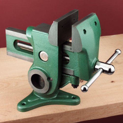 Product Descriptionp/pUniversal is an excellent way of describing this vise. The 3-1/2 wide by 2-1/8 high jaws have a 5 open capacity, in either a vertical or horizontal position. The faces are drilled to accept wood facings, there is a small anvil, and the vise rotates 360? on its base, locking tight as soon as an item is secured in the jaws. The handle and thread are chrome plated for durability. Bolt holes in the base legs make it easy to attach the vise to a bench top.